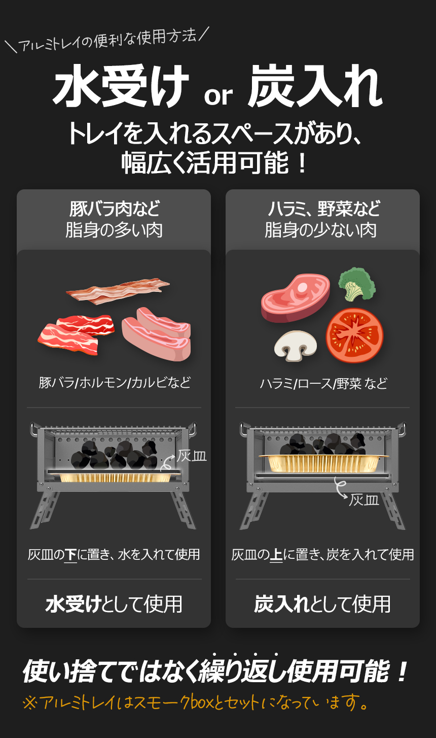 スモークBOXに付属しているアルミトレイを水受けとしてご使用ください。こちらのアルミトレイは通常のホイル素材よりも丈夫な素材で作られていますので、複数回ご使用いただけます。