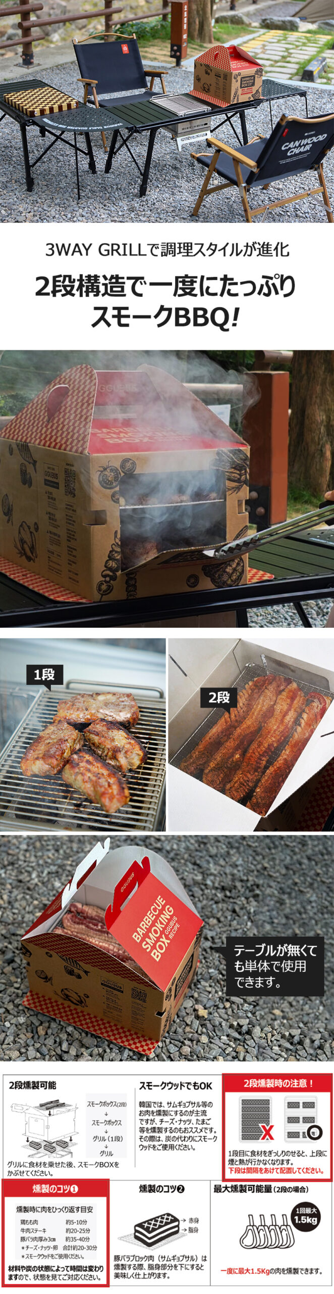 地面で使用される場合は、3WAY GRILLとの併用はできませんので、スモークBOX単体でご使用ください。その際は、1段のスモークが可能となります。
