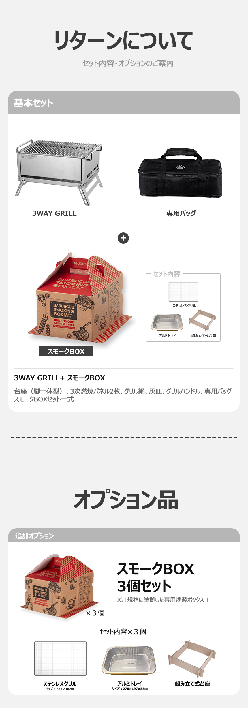 3WAY GRILLをBBQ、焚き火、燻製の3WAYで楽しんでいただきたいので、MakuakeではスモークBOXもセットでお得にご購入いただけるリターンのみ準備しております。